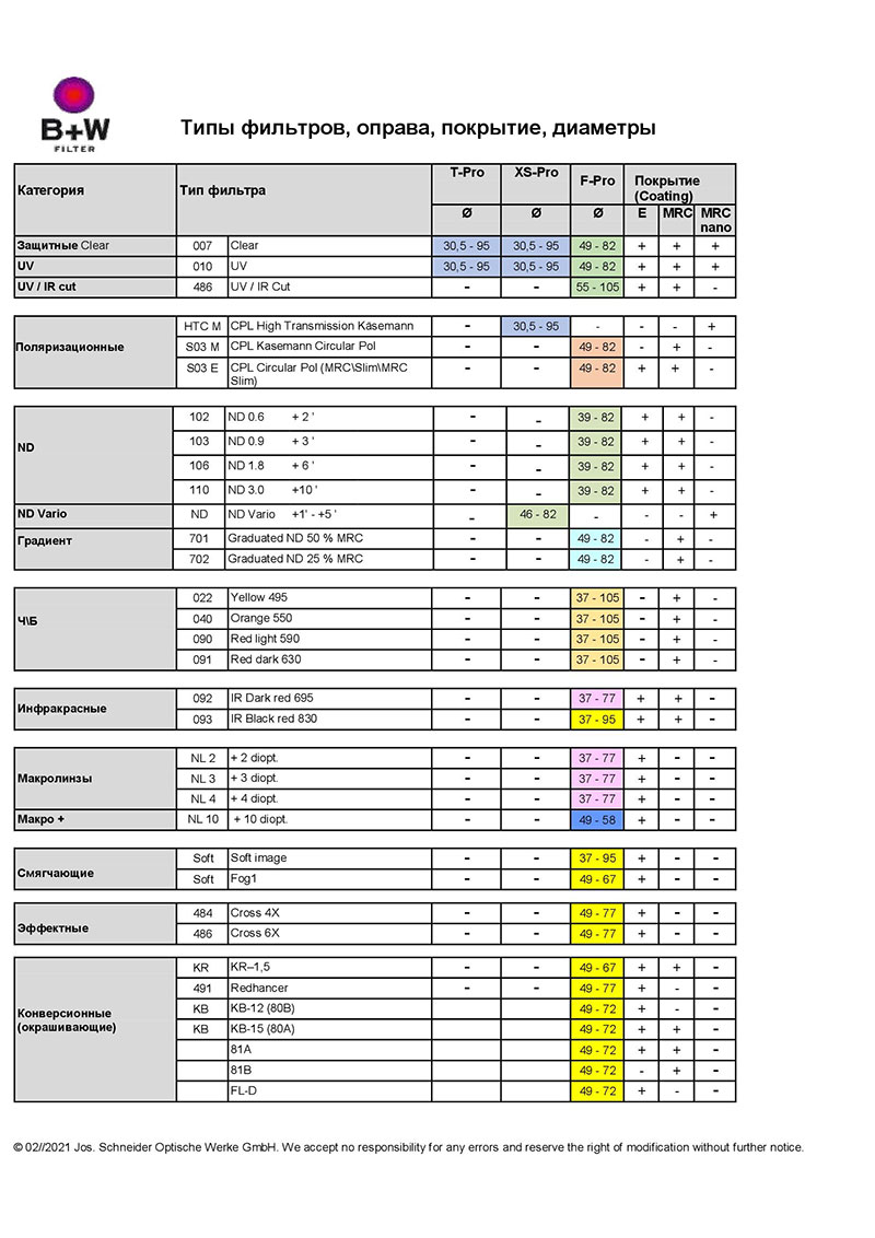 Серия B + W Titanium (T-Pro)Серия B + W Premium (XS-Pro Digital)Серия B + W Professional (F-Pro)